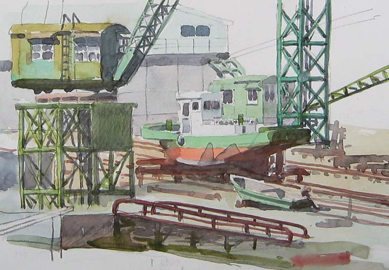 作業船や造船所は理屈抜きに大好きです、対岸の堤防から描きましたが、だんだん寒くなり雑な絵になってしまいました。