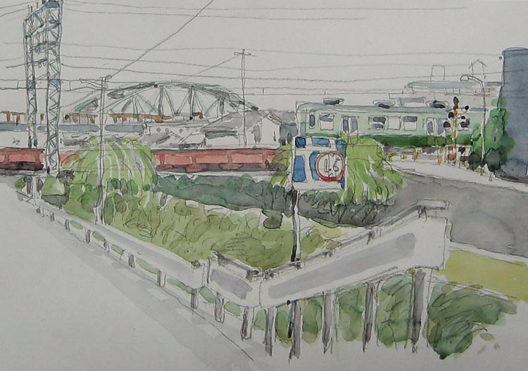 伏見の酒蔵を描くため立ち寄りましたが、柳が新芽を出していて蔵がよく見えないのと、観光絵葉書の様な景色だったので、誰も見向きもしない場所をスケッチしました。