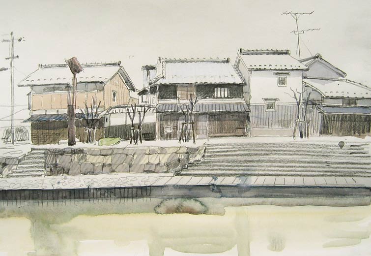 2月29日、今年最後と思われる寒波がやってきました、翌々日、まだ雪は残っているだろうと出掛けました、目的の彦根はぬかるんで歩く事が出来ませんでした、近江八幡は屋根に雪が残る程度で一枚スケッチしました。