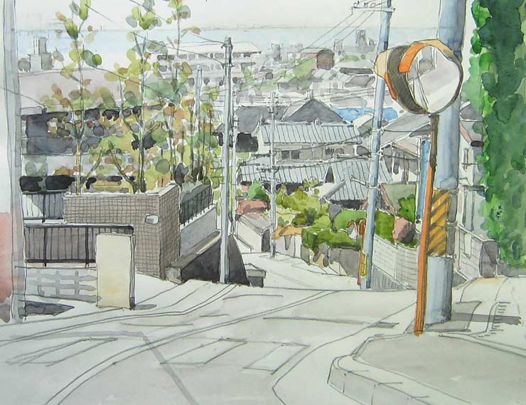 団地の中の急な坂道を描いてみたく何度か挑戦しましたがナットクのゆく絵が描けませんでした、今回再度挑戦した一枚です。