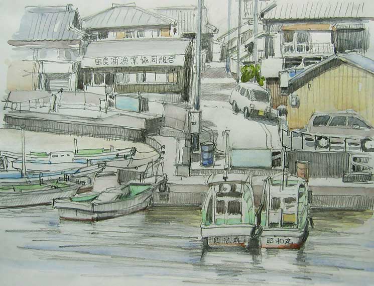 この漁港は何回も描いてみたいところです、風が凪ぐと漁船が水面に写り別世界になります、この日は時間が無くラフスケッチをし、家に帰ってから色を塗りました。