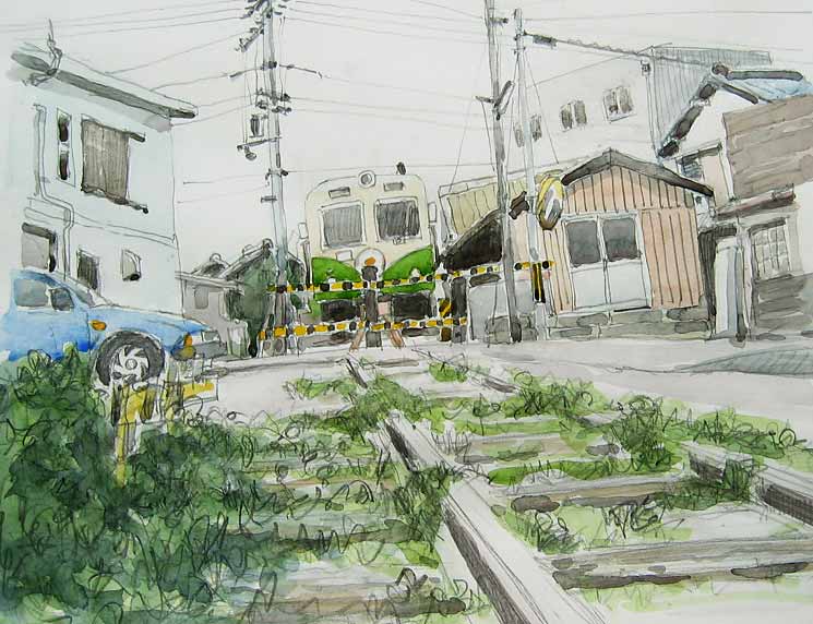 JR御坊駅と市街を結ぶローカル鉄道、地図で見て一度描いてみたく行きました、線路は直線で魅力無く、駅舎を描くにもそれらしき建物が無く、裏に回って描きました、狭い場所なので工夫した描き方をしなければならないようです。