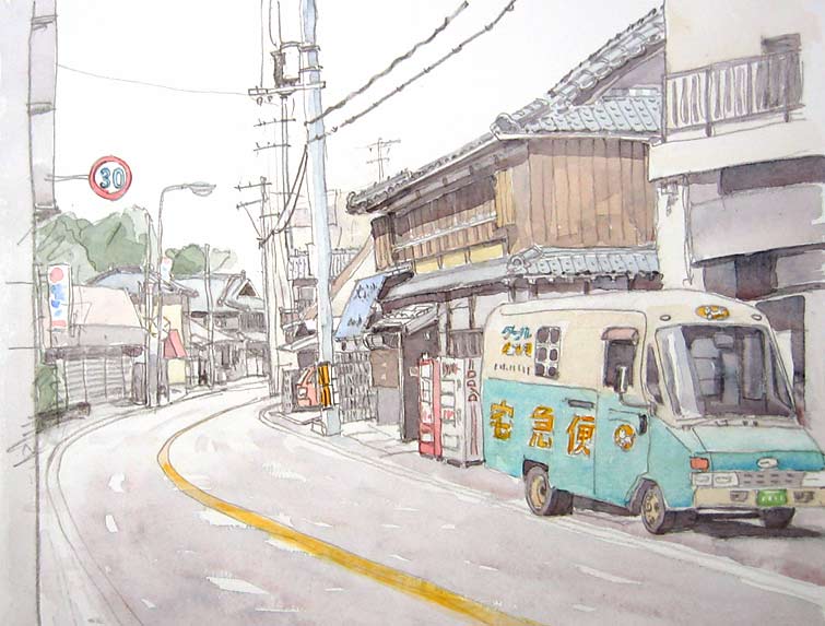 くろねこの自動車が大好きです、前から横から後ろから沢山スケッチしています、水間寺の門前町は何枚も描いています。
