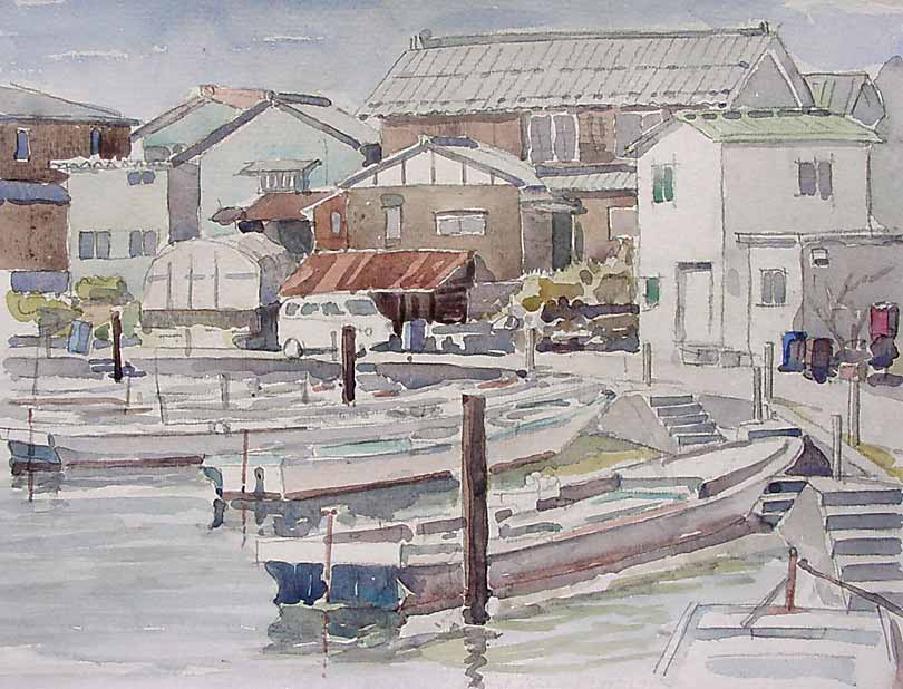 この運河はすぐ近くにある彦根城の堀に繋がっており、漁船、プレジャーボートなどが係留されており、何枚もスケッチしたい場所の一つです。