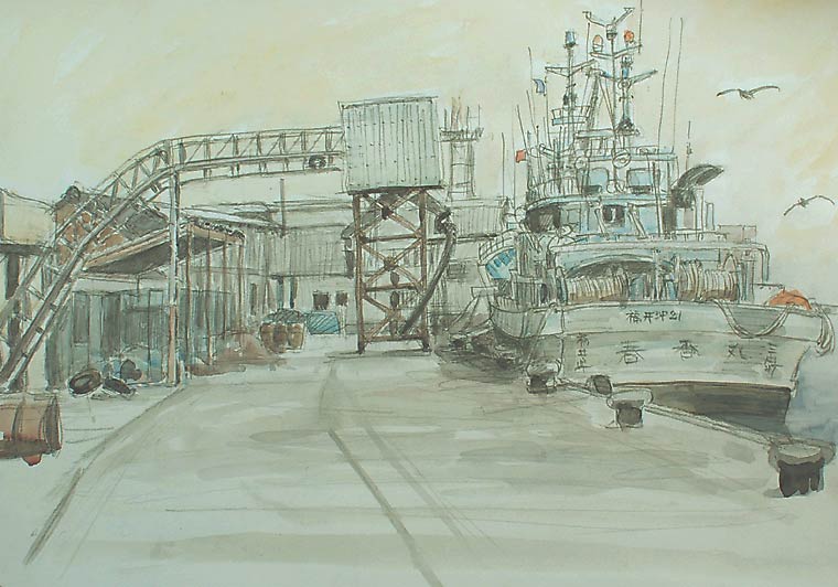 強風のため外に出る事もままならない日でした、港は休業、こんな場所にくるまを止めても邪魔にならず車内からスケッチです、フロントガラスは直ぐに白くななりワイパーのお世話になりながら一時間、家に帰って着彩、再生紙画用紙なるものを使用しましたが、これが全くの安物、絵の具の発色が悪いうえにベコベコに曲がりました、こんな紙を画用紙として売るのは間違いのように思いました、コピー用紙のほうがよっぽどましです。