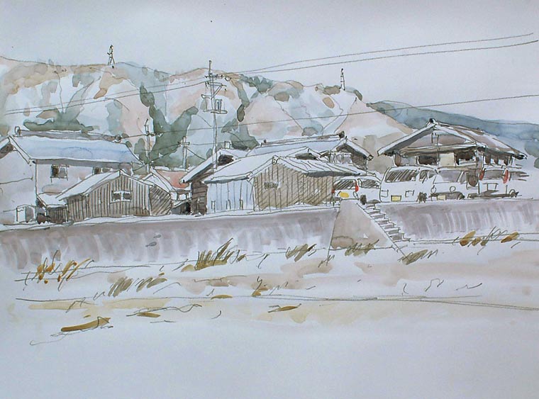 後ろにある山には残雪があり実に美しい景色に魅せられ描きましたが、雪のかけらも描く事が出来ませんでした^^; 手前の砂浜にも雪がありましたが、雪なのか塗り残しなのか区別がつきません、反省しきりです。