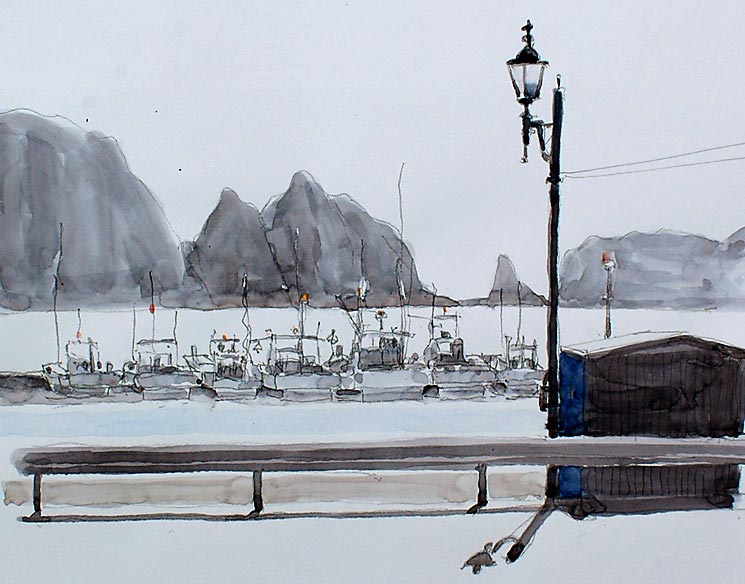 この様な逆光の景色が大好きです、第一細かなところが皆目解りませんのでごまかし絵画にピッタリです、モデルのように格好良い漁船がずらりと並んでいました、シビレます。