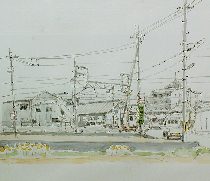 右衛門の診察が終わるまで病院近くのこの踏切りをスケッチしています、同じ構図で何枚も描きましたので、目を瞑っていても描けるほどになりました