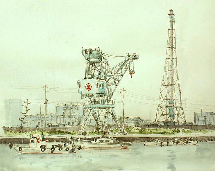 この大きなクレーンは侘しさ漂うこの港には無用の長物に見えましたが、クレーンを描くのは大好きです、右の大きな煙突は多奈川発電所のものです。