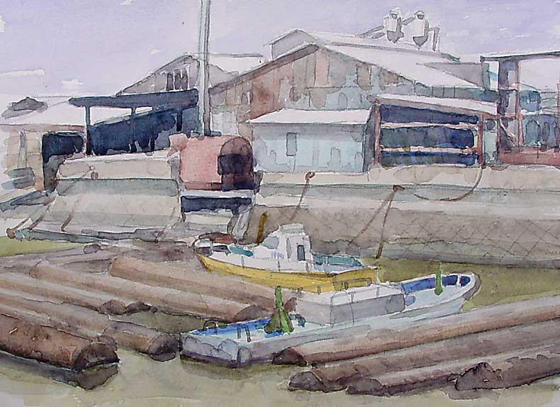 休日の製材所はひっそりとしていました、広々とした場所でのんびりと写生が出来ますし、大好きな船もあるし、次回は油で描こうと思っています。