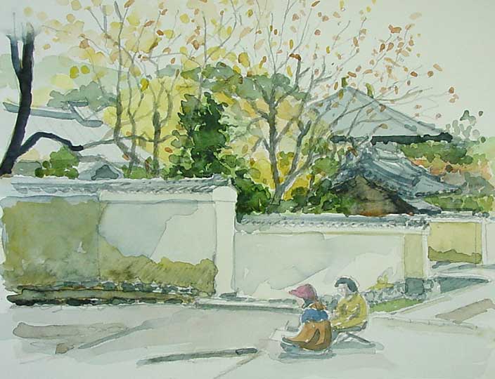 11月 23日 お昼前に到着しましたが、朝の冷え込みも和らぎポカポカのスケッチ日和となりました。沢山の方が描いており、私は描いている人を描きました、もっと沢山の方々が居たのですが二人だけ前景に入れてみました、後ろの建物は東大寺大仏殿で