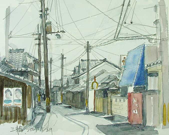 狭い道路の両側に林立する電柱と蜘蛛の巣のような電線に魅力を感じ描きました。