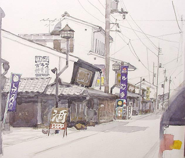 長浜市の北国街道は私の好きな所です、この絵は今までの描き方と少し違います、空や道路を極端に色を薄くしました、暫くこんな描き方に挑戦したく思っています。