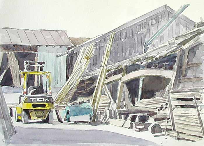 製材所のゴチャゴチャした雰囲気が大好きで何枚も描いていますが私の技量では難しいモチーフです。