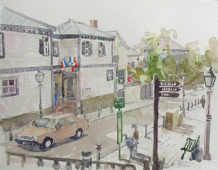 階段に陣取って描きましたが恥ずかしかったです、どうしても絵はがきのような構図になってしまいます。
