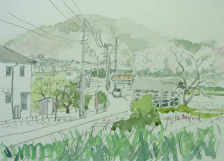 満開のサクラを描きに行ったのに電柱を描いてしまいました、手前の緑は玉葱ですがうまく描けませんでした。