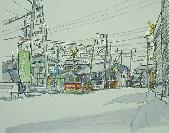 JR阪和線の踏み切りです、電柱に次いで遮断機も描いてみたいモチーフの一つです。