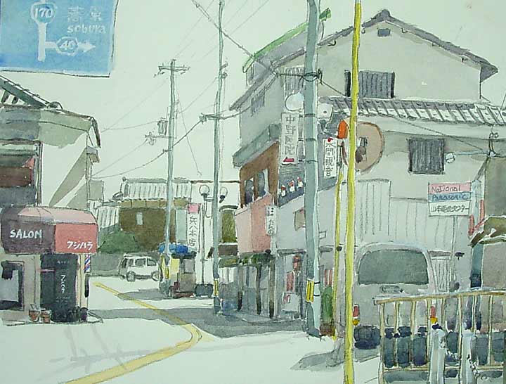 気温は低いものの日差しは強く眩しいくらいです、好きな街の景色なのでいっきに描きました、今、この絵をもとに油で描いています