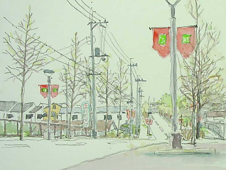 坂道とアメリカフウの梢に惹かれ2枚描いたうちの一枚です