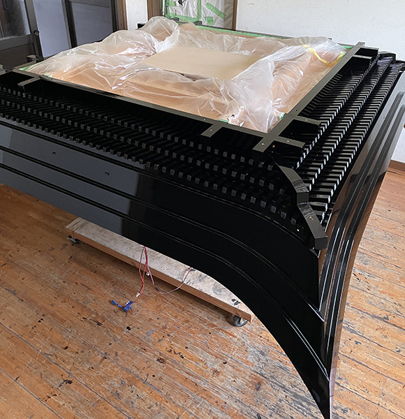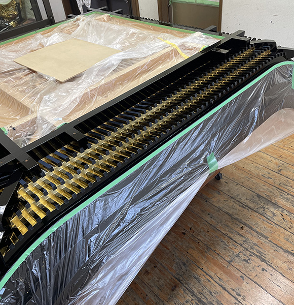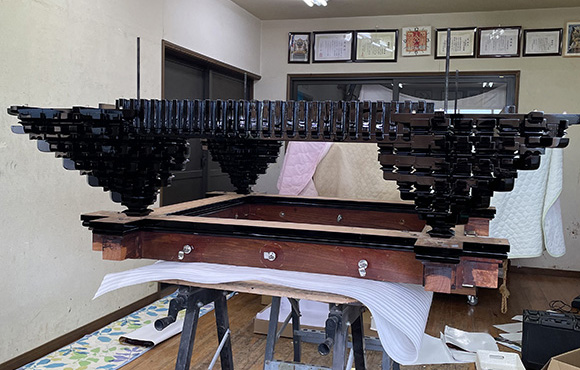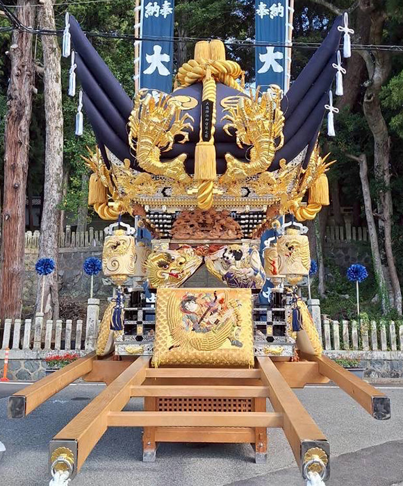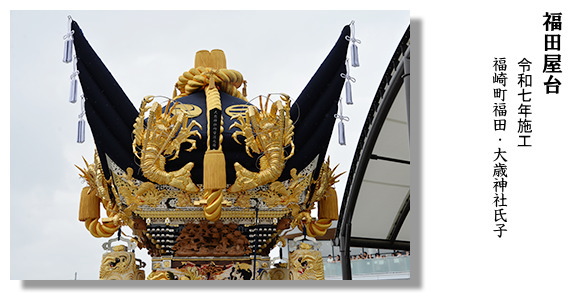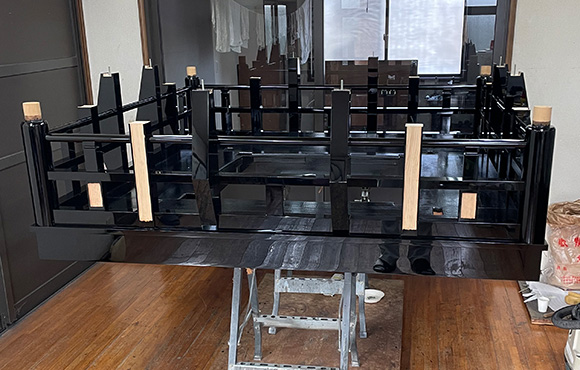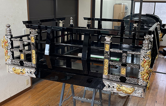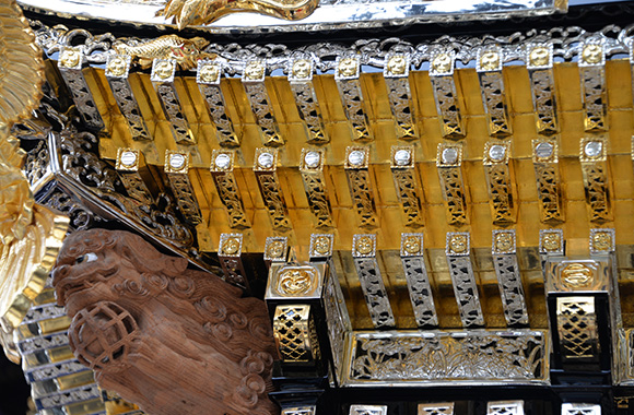屋台の改修に伴う水切周り、高欄の漆塗りと軒周りの箔押しを施工しました。
