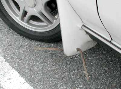 愛車、「へらーり」注:フェラーリではない。へらーり。 前任地で、10年、10万Kmを越えた車は、フリーエージェントとして自由に名前を付けて良い、と私が決めた。 単身赴任地の某県三田市から、自宅の某神戸市へと抜ける道路を走行中、突然、ガツン! と衝撃、そしてガガガガガッ!、と振動と激しい異音!! 急ブレーキ掛けたルームミラーに四駆が急接近、「ヤバイッ! 無事故無検挙もこれまでか・・・」と、ブレーキを弛めると追突寸前で後続車もブレーキ あらためて道路脇に停めると・・・ 道路に落ちていた鉄筋の切れ端を踏んだらしく、泥よけに、その鉄筋が串刺し・・・ まあ、追突もされず、ブレーキも痛めず、パンクもせず、良かった良かった・・・・ 真夏のアップロードにしてはタイヤのトレッドパターンが・・・? そうです! 異常気象の昨今、いつ雪が降ってもいいようにスタッドレス! スタッドレスのヘナヘナ・コーナリング、そして窓全開(エアコン故障中・・・)で走れば体感スピードは +20km! |