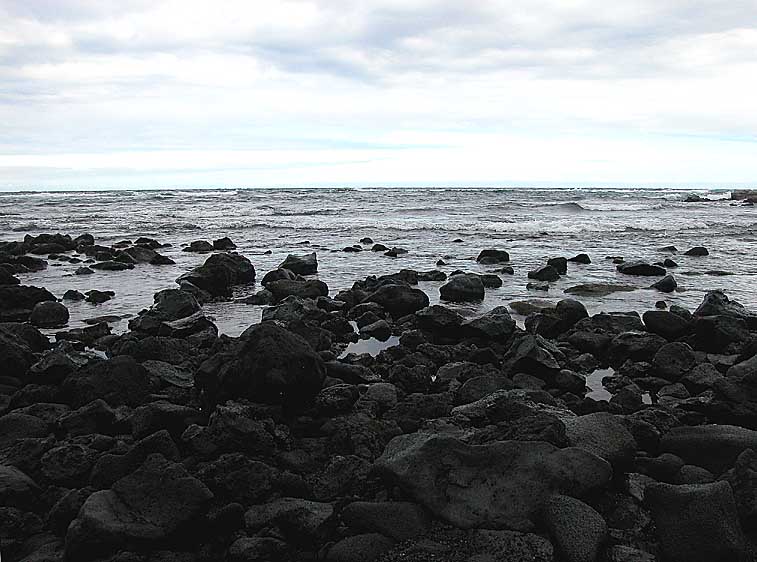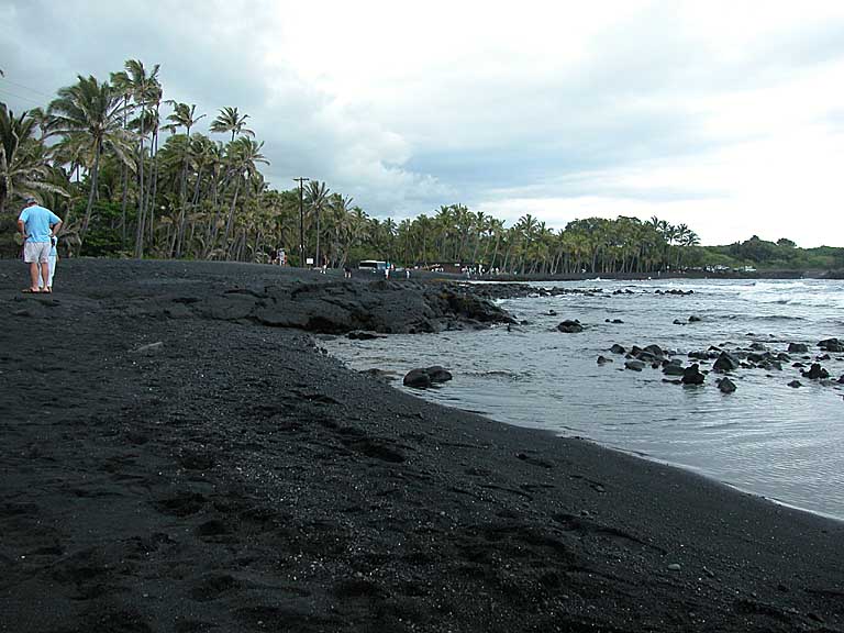 ここは、ハワイ島のハワイ火山国立公園に近い海岸です。溶岩が海に達したあと、細かく砕けて砂になったらしいですが、どうしてこんなに細かい砂になるのか不思議です。ただ、普通の砂に比べればやや粒は大きいですが。とは言っても小石ではなくてあくまで砂です。乾いていると濃い灰色ですが、濡れていると真っ黒になるので、波の打ち寄せる場所では黒一色で、すごく不思議な感じです。妻に言わせるとキャビアみたいだそうですが。。。(^_^;)