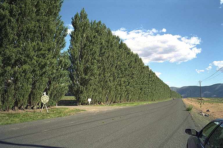 コロンビア川のダムであるWanapum Damを見物し、WA-243を南下すると、道沿いに大規模な果樹園が出現します。非常に背が高くてまっすぐな木が防風林として整然と植えてあり、壮観です。