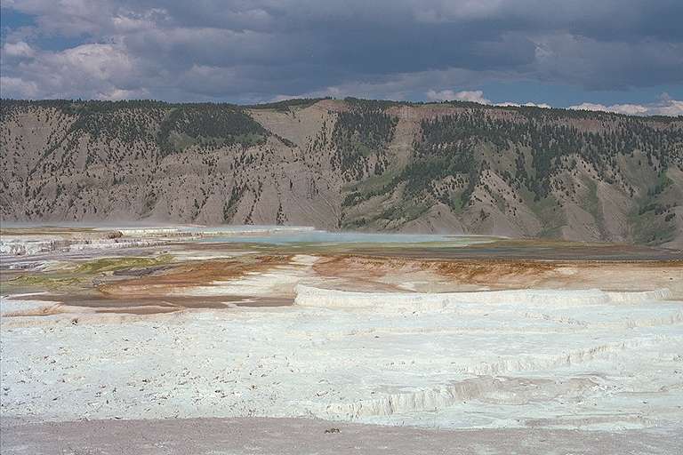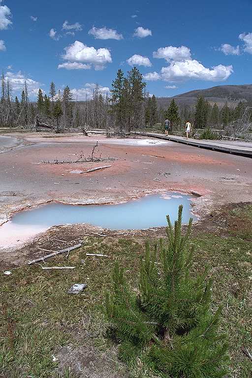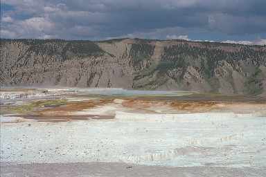 谷の部分は濁った薄青のプール(温泉)などがありますが、イエローストーンではありふれているものです。ここでトレイルをそのまま引き返す人もいましたが、それではつまらない。(^^;)