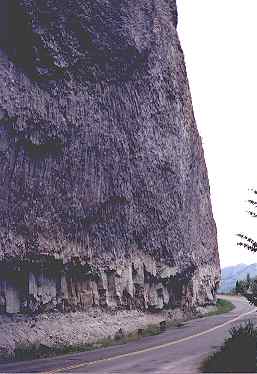 とちゅう、険しい崖からいまにも尖った岩が落ちてきそうな、迫力ある光景の場所を通ります。