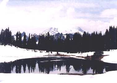 ここでも残念ながらレイニア山には雲がかかっています。 部分的に雪が融けて穴になっている場所があり、そこからは雪解け水の小さな川ができて湖に流れ出し、草がさっそく芽を出しています。