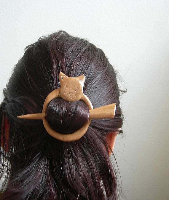 猫がモチーフされた木製のヘアアクセサリーです♪