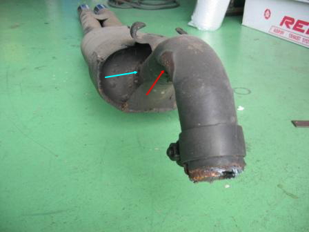 青矢印の所から排気漏れが、赤矢印の部分が当たっていたようです。