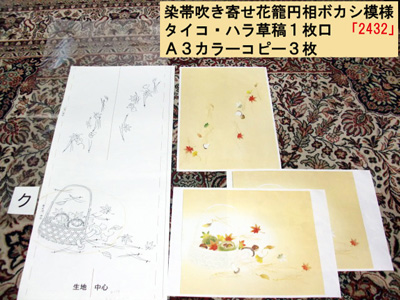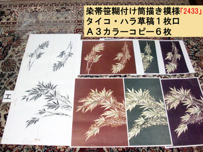 染帯用・笹糊付け筒描き「2433」 (線画草稿)下絵は1枚 タイコ・ハラA3サイズカラーコピー6枚です。 販売価格8000円(税・送料込み) |