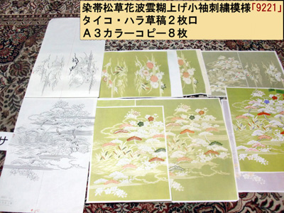 染帯用・松草花波雲糊上げ小袖刺繍「9221」 (線画草稿)下絵は2枚口 A3サイズカラーコピー8枚です。 販売価格8000円(税・送料込み) |