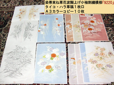 染帯用・束ね草花波糊上げ小袖刺繍「9220」 (線画草稿)下絵は1枚 A3サイズカラーコピー10枚です。 販売価格8000円(税・送料込み) |