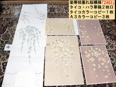 染帯用・枝垂れ桜「2463」 (線画草稿)下絵は2枚口 タイコカラーコピー1枚 A3サイズカラーコピー3枚です。 販売価格8000円(税・送料込み) |