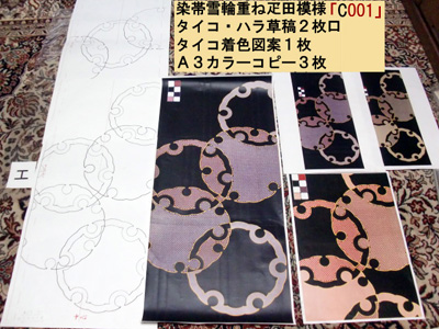 染帯用・雪輪重ね疋田「C001」 (線画草稿)下絵は2枚口 タイコ柄着色図案カラーコピー1枚 A3サイズカラーコピー3枚です。 販売価格8000円(税・送料込み) |