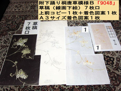 附下着尺用・踊り桐唐草B「9048」 下絵(線画草稿)7枚と上前カラーコピー1枚 上前着色図案1枚+A3サイズ図案1枚 販売価格15000円(税・送料込み) |