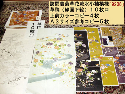 訪問着用・菊草花流水小袖「9208」 下絵(線画草稿)10枚と上前カラーコピー4枚 A3サイズ参考コピー5枚 販売価格25000円(税・送料込み) |