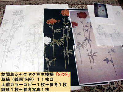 訪問着用シャクヤク写生「9229」 下絵(線画草稿)11枚と上前カラーコピー枚+参考1枚 雛形+参考写真1枚 販売価格25000円(税・送料込み)」 |