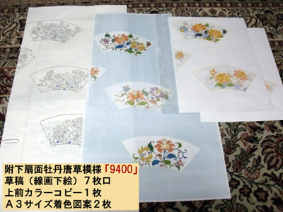 附下着尺用・扇面に牡丹唐草「9400」 下絵(線画草稿)7枚と上前カラーコピー1枚 A3サイズ着色図案2枚 販売価格15000円(税・送料込み) |