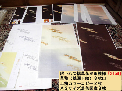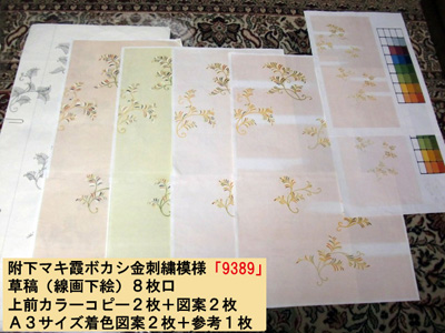附下着尺用・マキ霞ボカシ金刺繍「9389」 下絵(線画草稿)8枚と上前カラーコピー2枚+図案2枚 A3サイズ着色図案2枚+参考1枚 販売価格15000円(税・送料込み) |