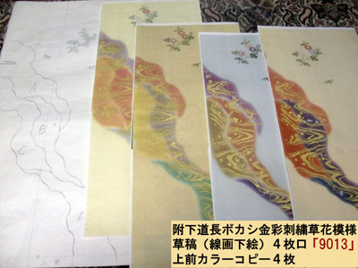附下着尺用・道長ボカシ金彩刺繍草花「9013」 下絵(線画草稿)4枚と上前カラーコピー4枚 販売価格15000円(税・送料込み) |