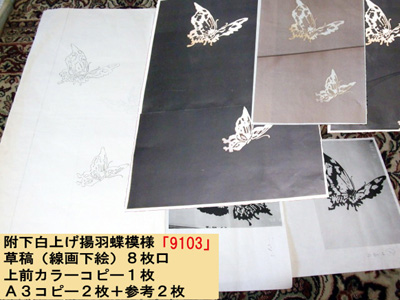 附下着尺用・白上げ揚羽蝶「9103」 下絵(線画草稿)8枚と上前カラーコピー1枚 A3コピー2枚+参考2枚 販売価格15000円(税・送料込み) |