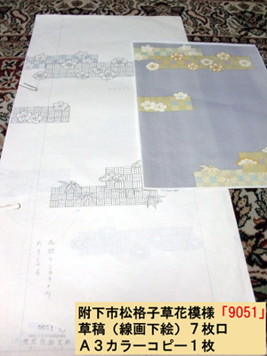 附下着尺用・市松格子草花「9051」 下絵(線画草稿)7枚と上前カラーコピー1枚 販売価格15000円(税・送料込み) |