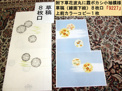 附下着尺用・草花波丸に霞ボカシ小袖「9227」 下絵(線画草稿)8枚と上前カラーコピー1枚 販売価格15000円(税・送料込み) |