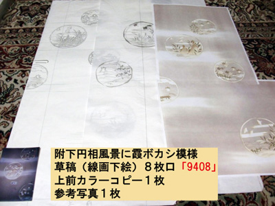 附下着尺用・円相風景に霞ボカシ「9408」 下絵(線画草稿)8枚と上前カラーコピー1枚 販売価格15000円(税・送料込み) |