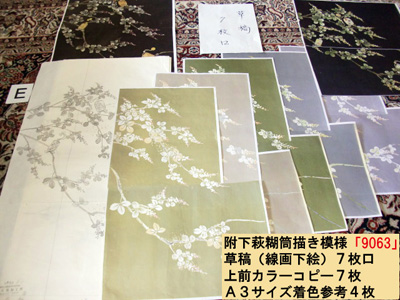 附下着尺用・萩糊筒描き「9063」 下絵(線画草稿)7枚と上前カラーコピー7枚 A3サイズ着色参考4枚 販売価格15000円(税・送料込み)」 |