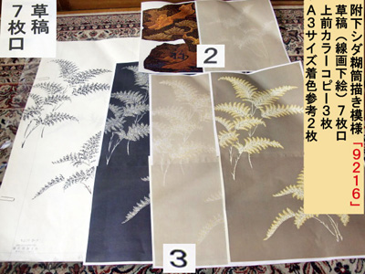 附下着尺用・シダ糊筒描き「9216」 下絵(線画草稿)7枚と上前カラーコピー3枚 A3サイズサンプル2枚 販売価格15000円(税・送料込み) |