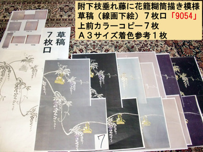 附下着尺用・枝垂れ藤に花籠糊筒描き「9054」 下絵(線画草稿)7枚と上前カラーコピー7枚 A3サイズ参考1枚 販売価格15000円(税・送料込み) |